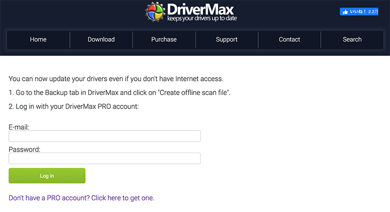 3. DriverMaxインストール後のPRO版のライセンス登録時に入力したメールアドレスを「E-mail:」欄に、パスワードを「Password:」欄に入力し「Log in」ボタンをクリックします。