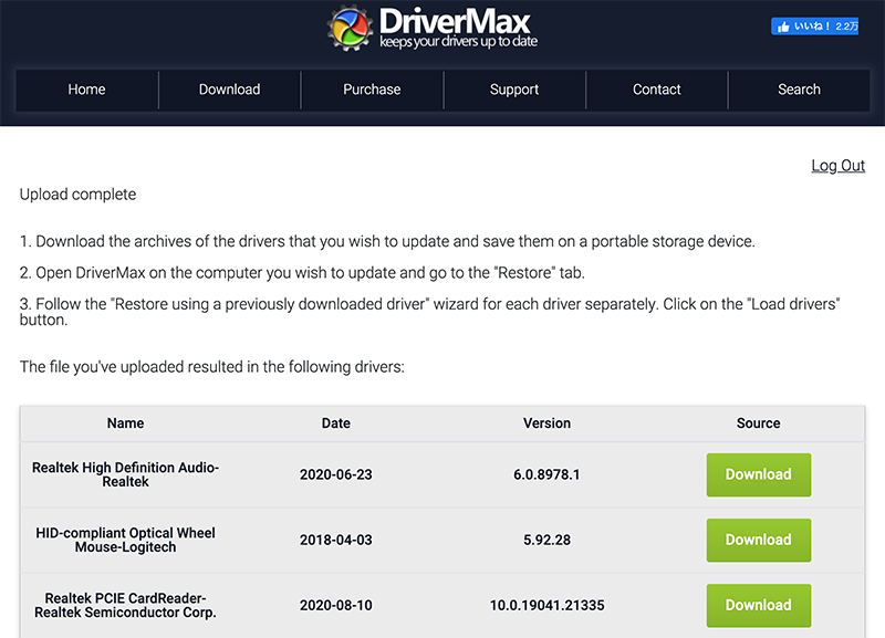 5. ドライバーリストのアップロードが完了すると、必要なドライバーの一覧が表示されます。更新したいドライバー右側の「Download」ボタンをクリックし、ドライバーファイルをダウンロードしてください。