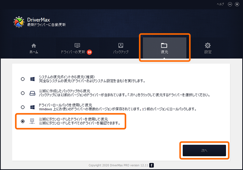 2. DriverMaxの「復元」タブで「以前にダウンロードしたドライバーを使用して復元」を選択し「次へ」をクリックします。
