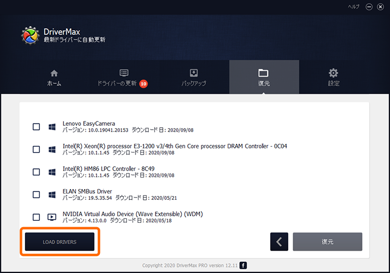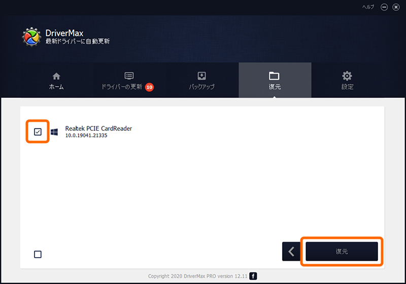 5. 選択したドライバーが表示されます。ドライバー左側のチェックをオンにし「復元」をクリックします。インストール完了までしばらくお待ちください。