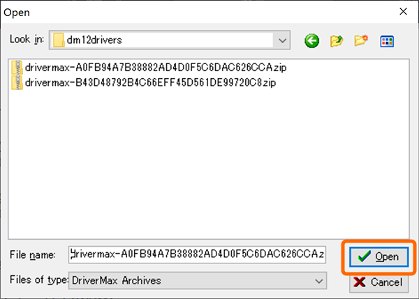 4. 表示されたダイアログで任意のドライバーファイルを選択し「Open」をクリックします。