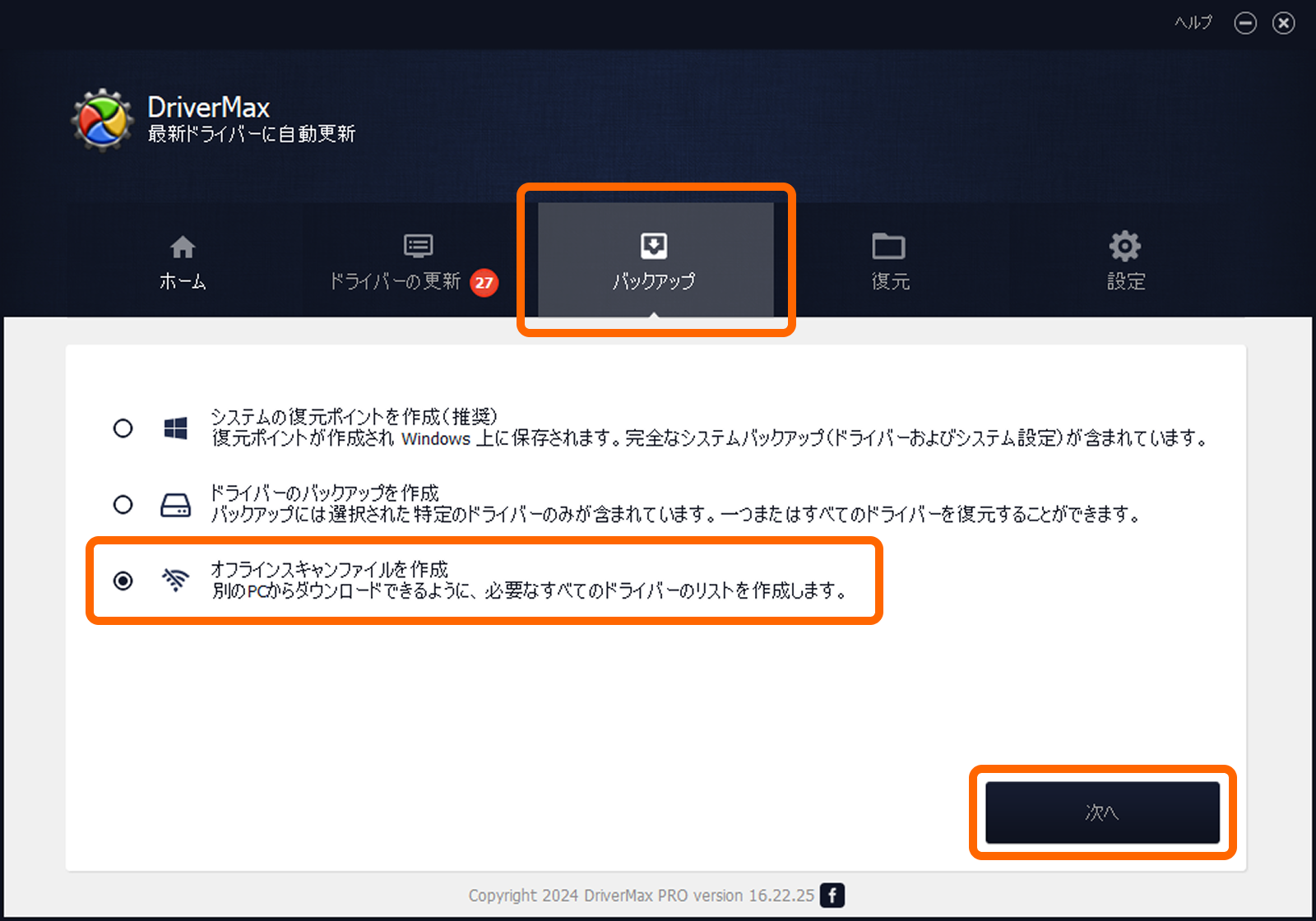 2. 「バックアップ」画面の「オフラインスキャンファイルを作成」を選択後、「次へ」をクリックします。